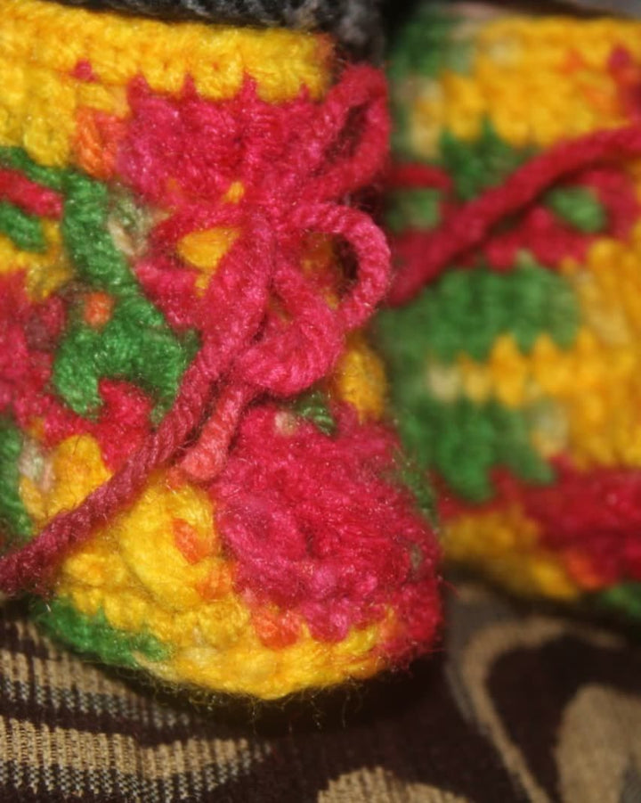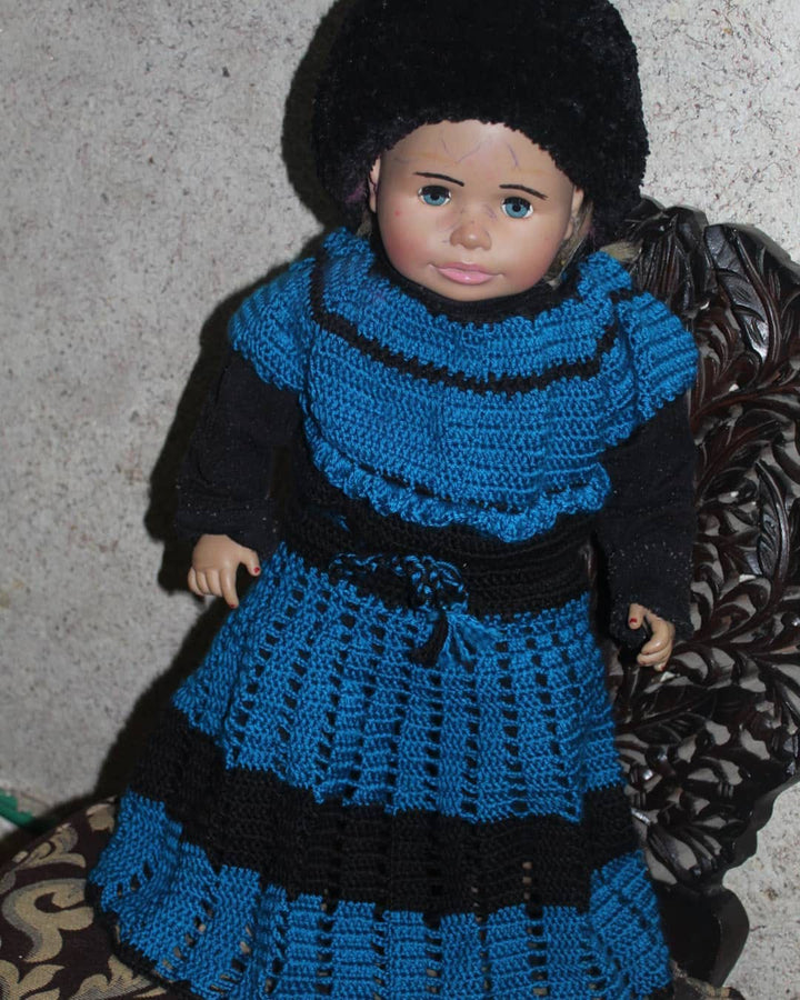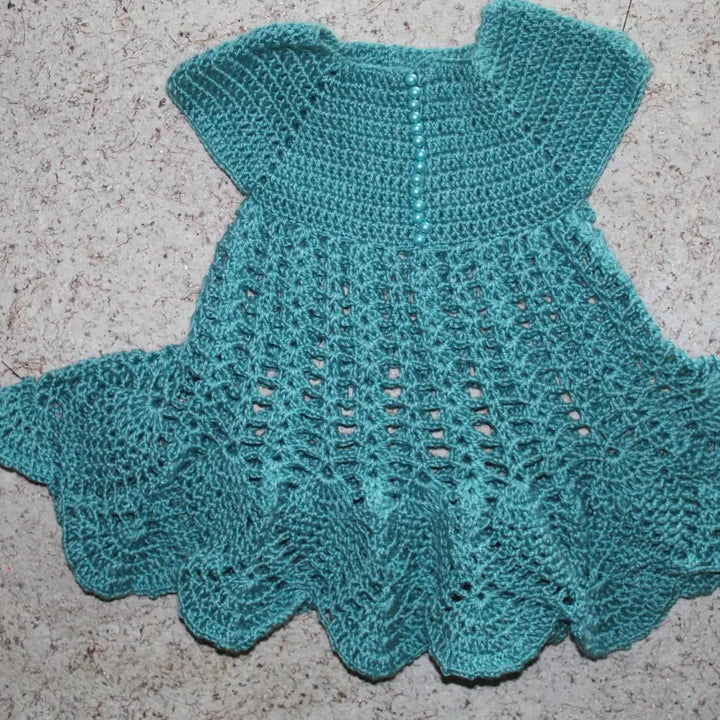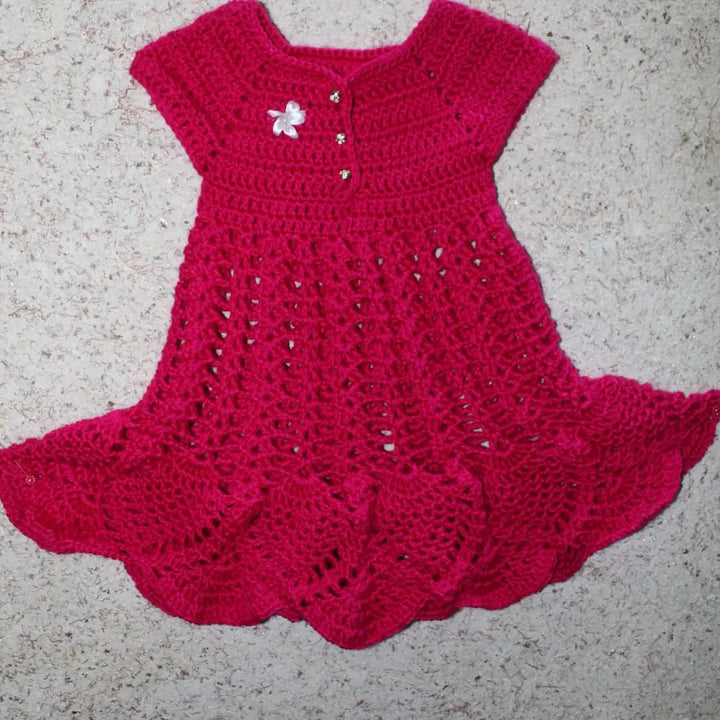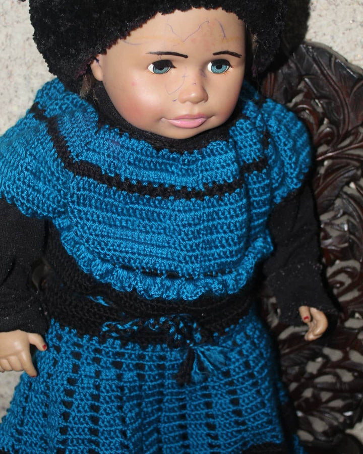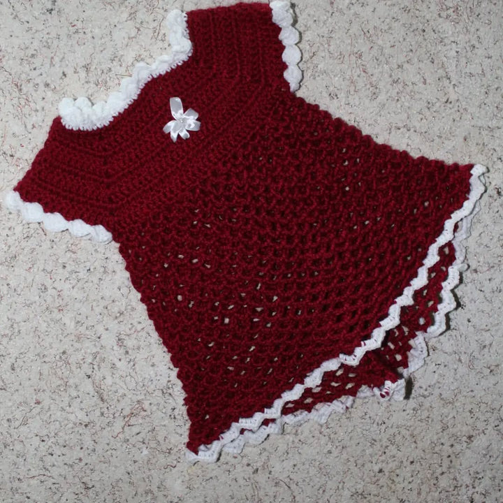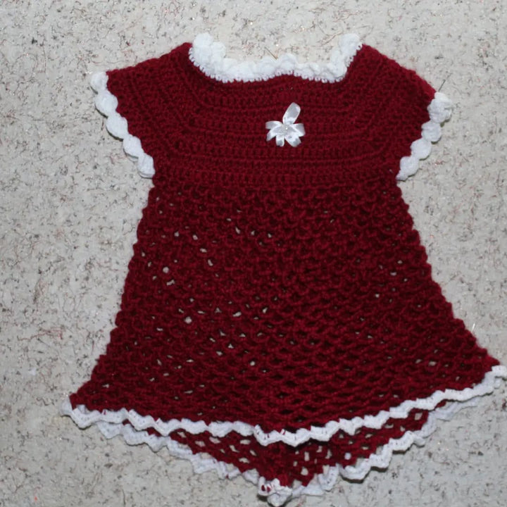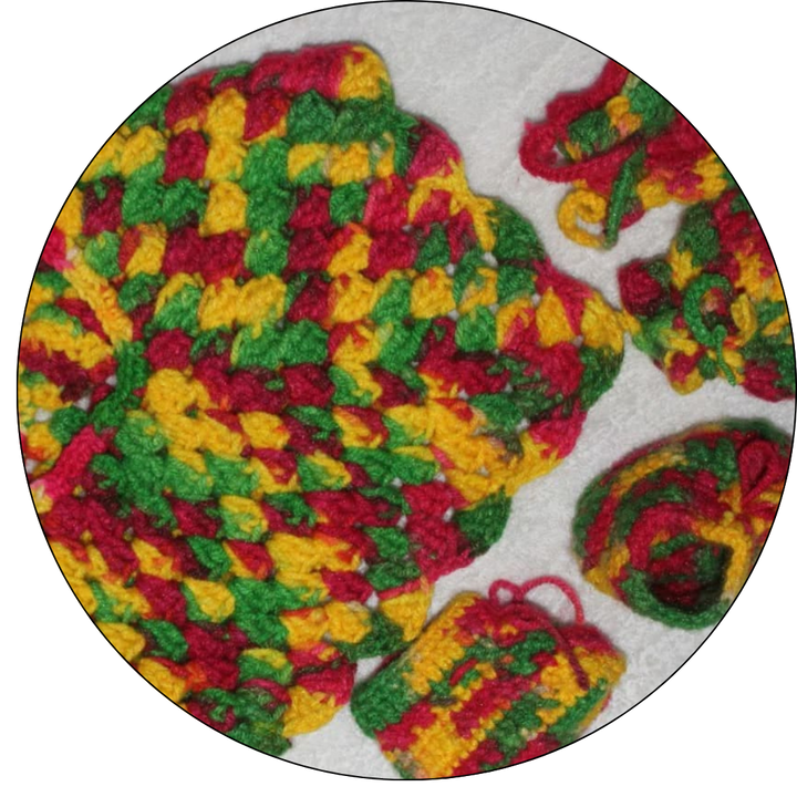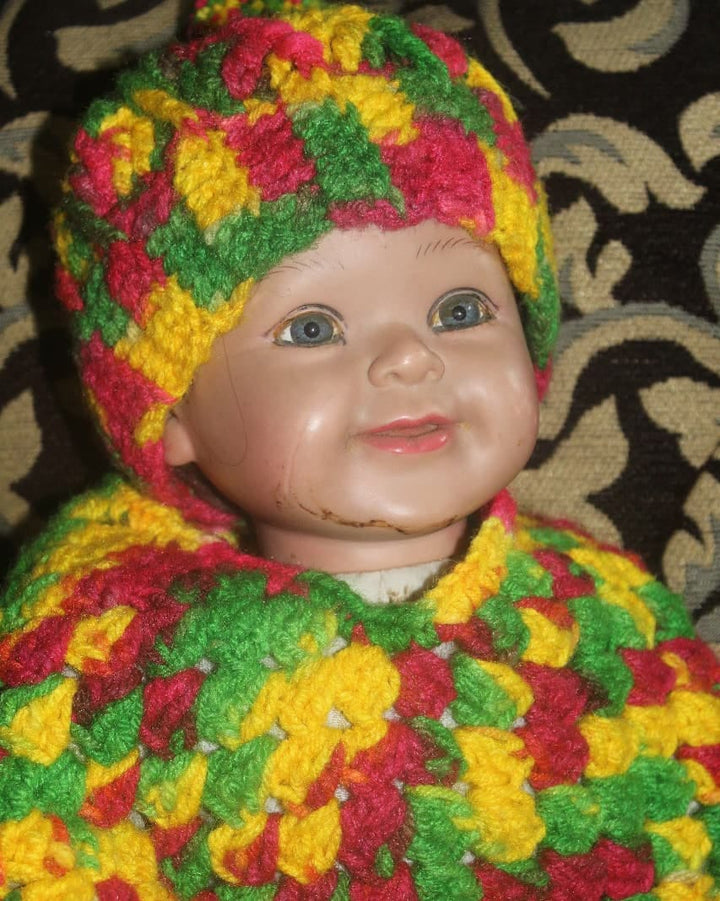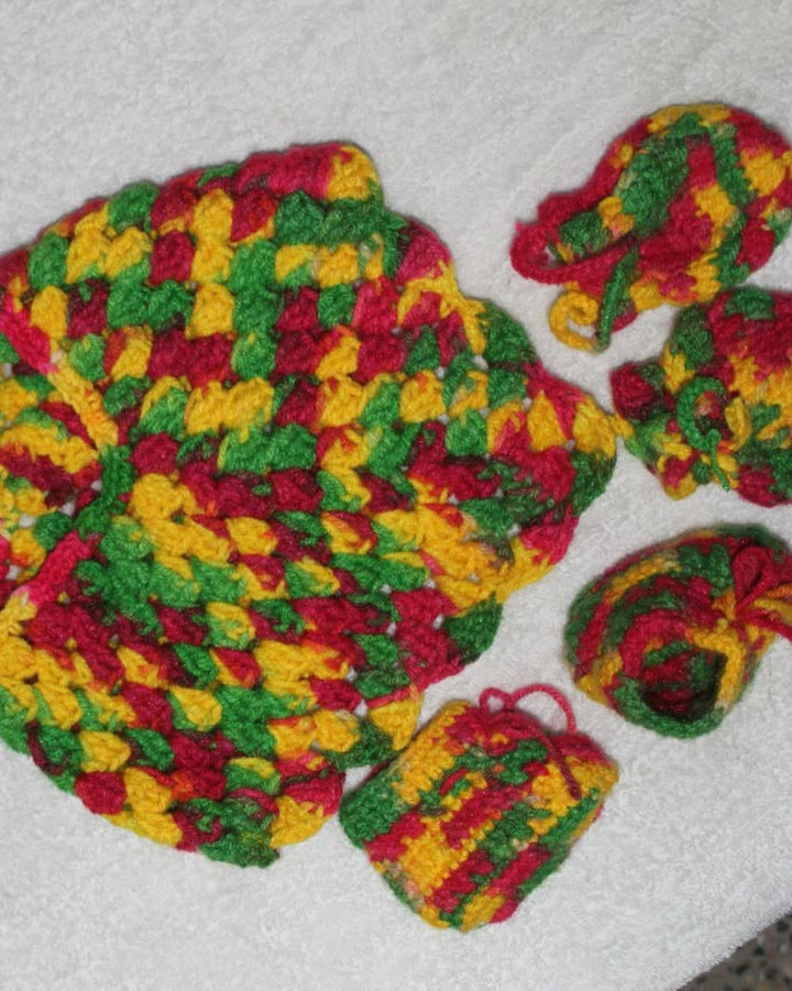 Look at this gorgeous, handmade crochet set! Includes a scalloped-edge dress and three matching accessories (booties, mittens, etc.), all in stunning primary colors. An ideal, unique gift for a newborn or a beautiful addition to a professional craft collection.