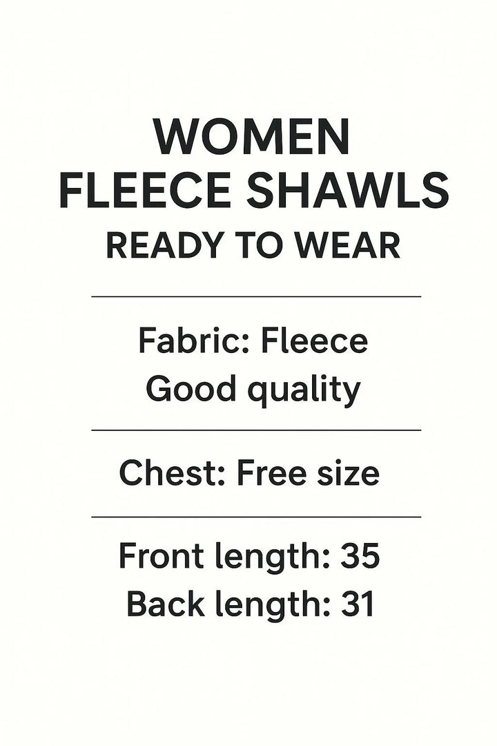 • Fabric: Fleece• Pattern: Plain• Color: Golden• Package Includes: 1 x Cape Shawl• Length: 35 Inches• Winter arrival*• Women fleece shawls ready to wear• Fabric : *Fleece*• Good quality• free size• Chest free size• Front length 35• Back length 31• Note: There might be an error of 1-3 cm due to manual measurement, and slight color differences may occur as a result of varying lighting and monitor effects.